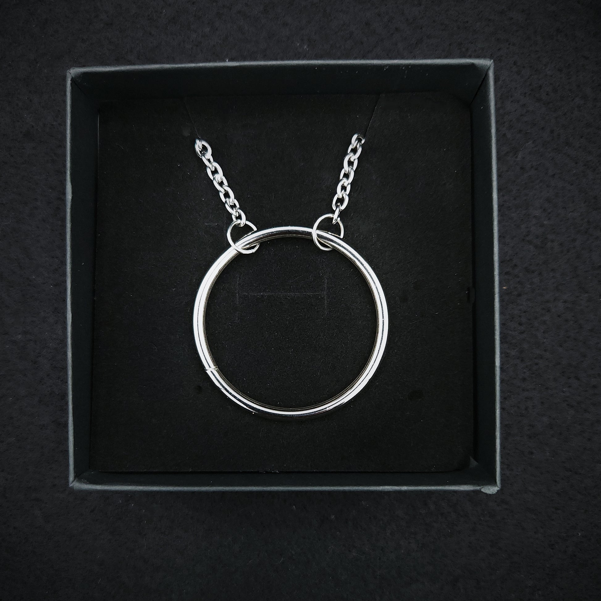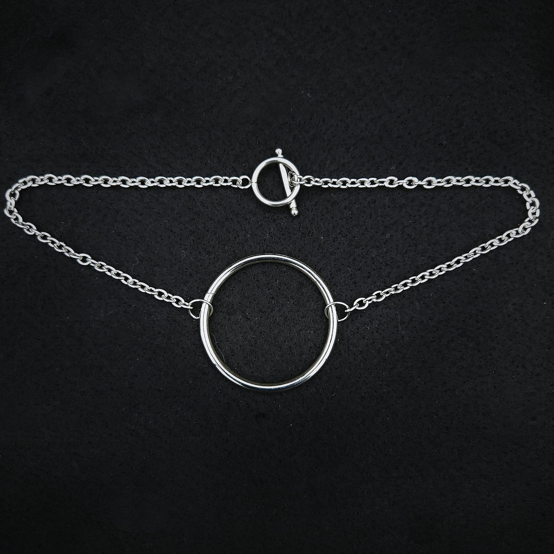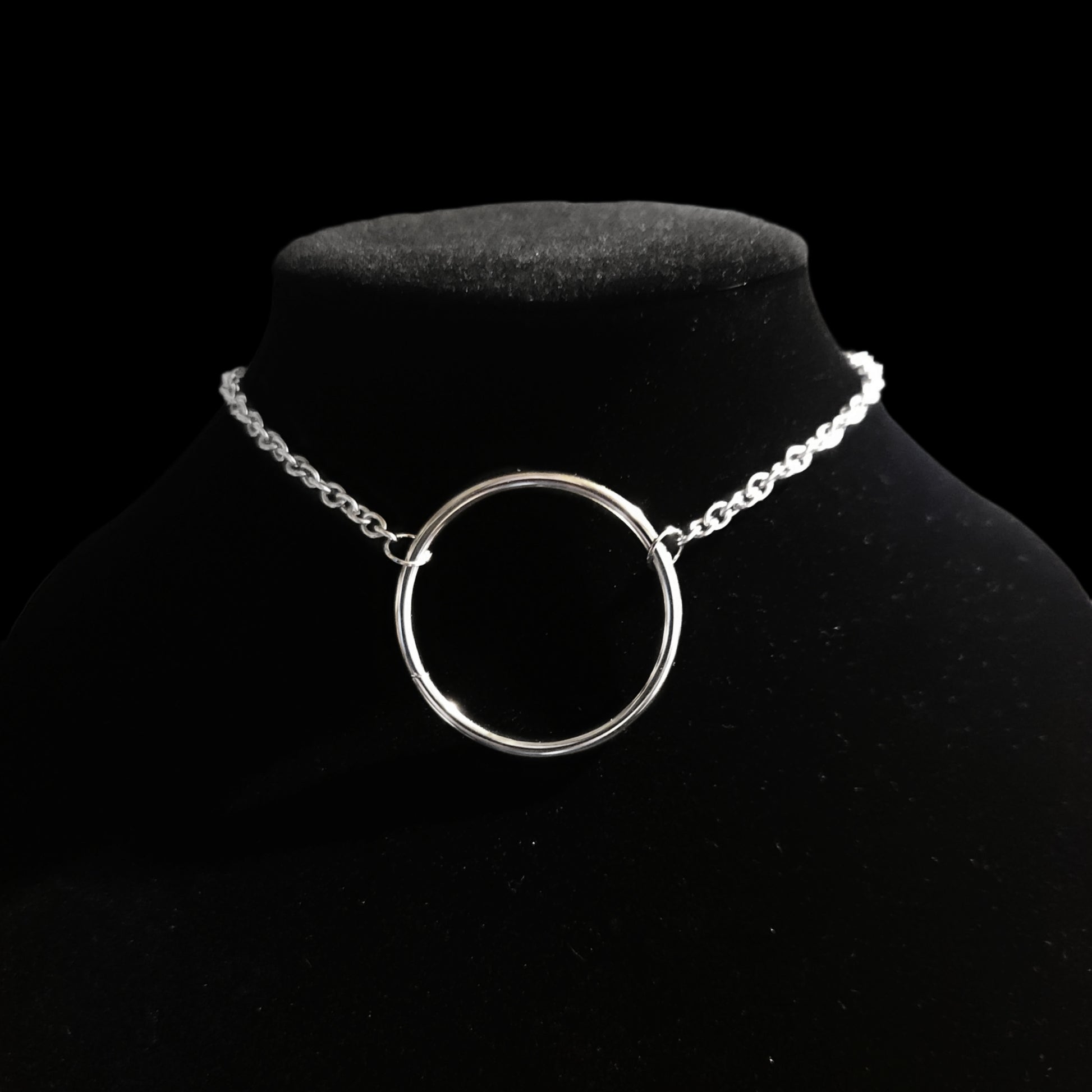 This is a chain choker with an O-ring. It comes in 3 different sizes (15", 15.5", 16"). There is not adjustable sizing so I would recommend measuring your neck beforehand. Instead, it comes with a toggle clasp in the back for easy closing and opening (and much more user friendly for those with nails).