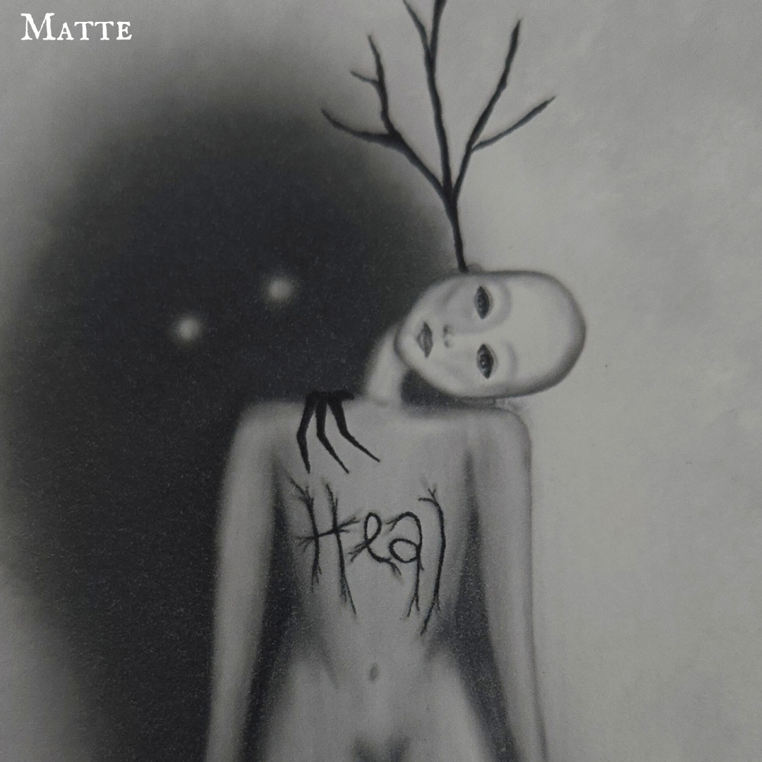 Matte- softer lines, texture on front and back, muted tones, sturdy paper