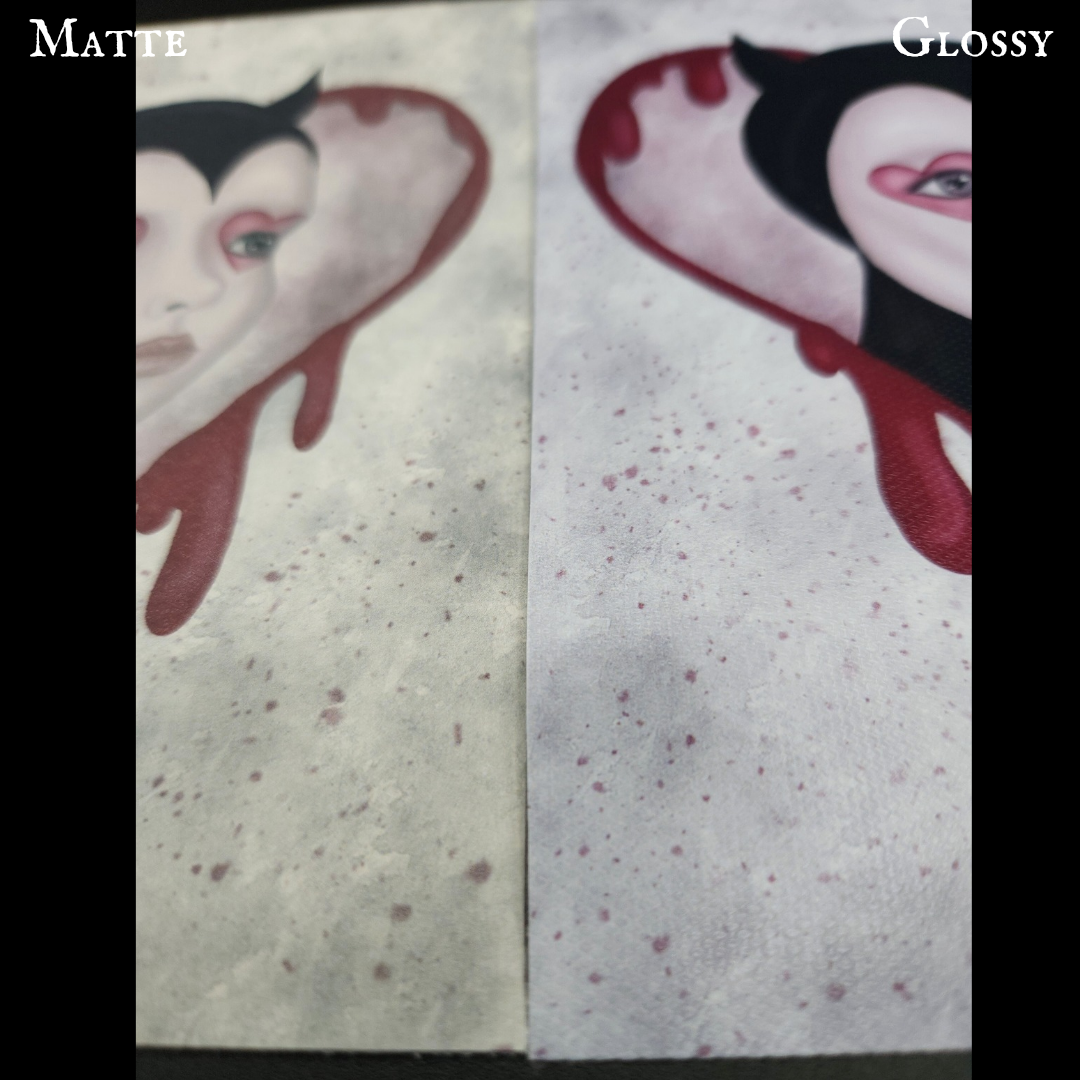 Gloss- high definition photo quality, strong color vibrancy, textured on the front and buttery smooth on the back