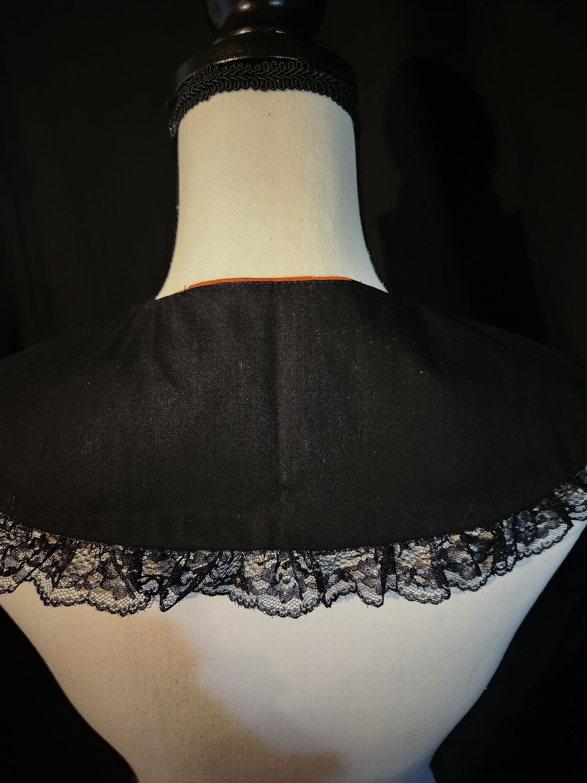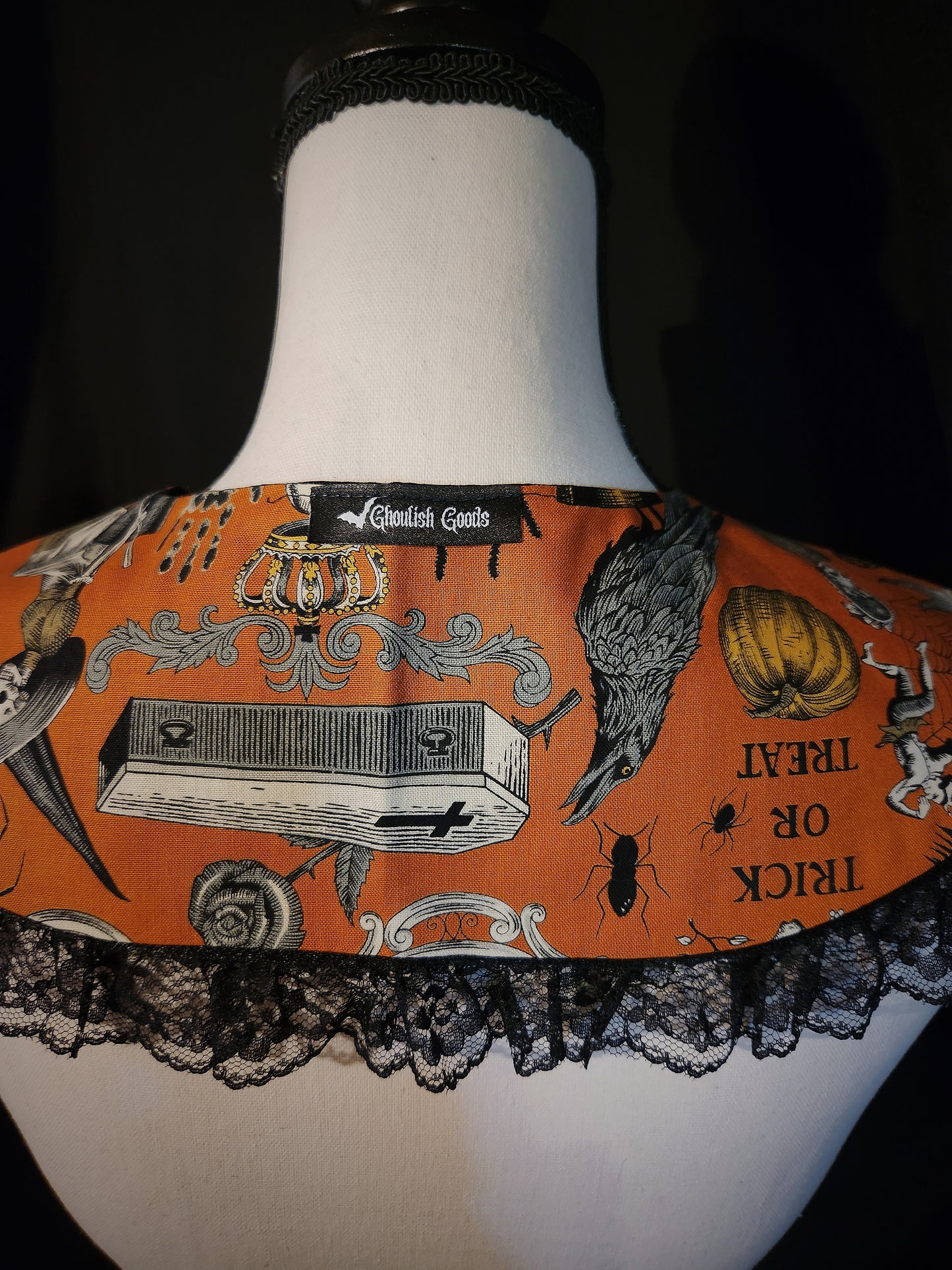This reversible collar has macabre Halloween graphics on one side and black on the other for maximum wearability. It has details of black ribbon ties and black lace ruffle trim.