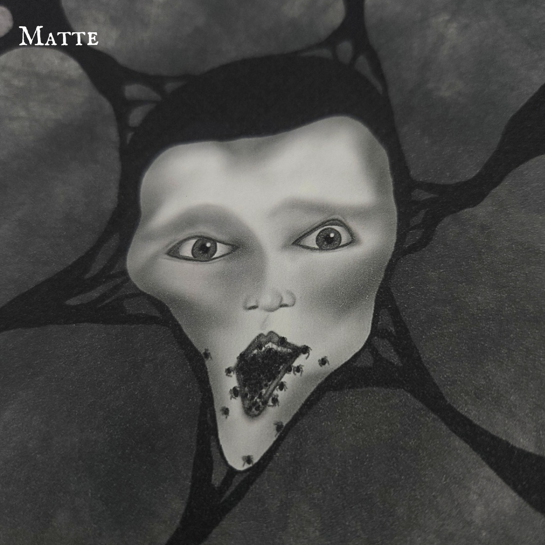 Matte- softer lines, texture on front and back, muted tones, sturdy paper
