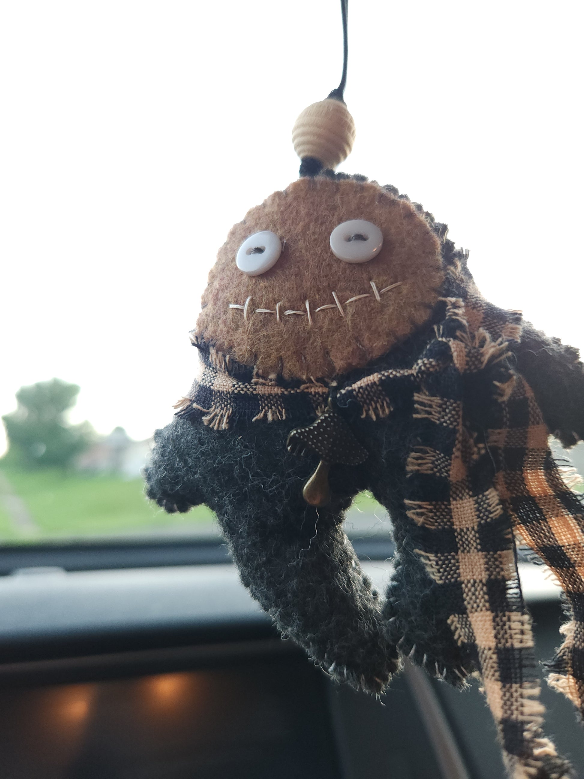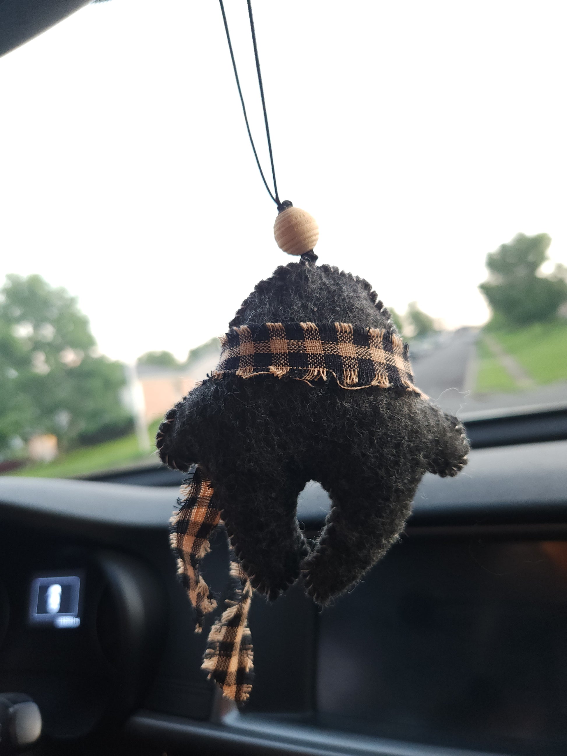 This is a handsewn plushie car freshener. It is designed to be hung from a rear view mirror. Each plush is unique and individual.