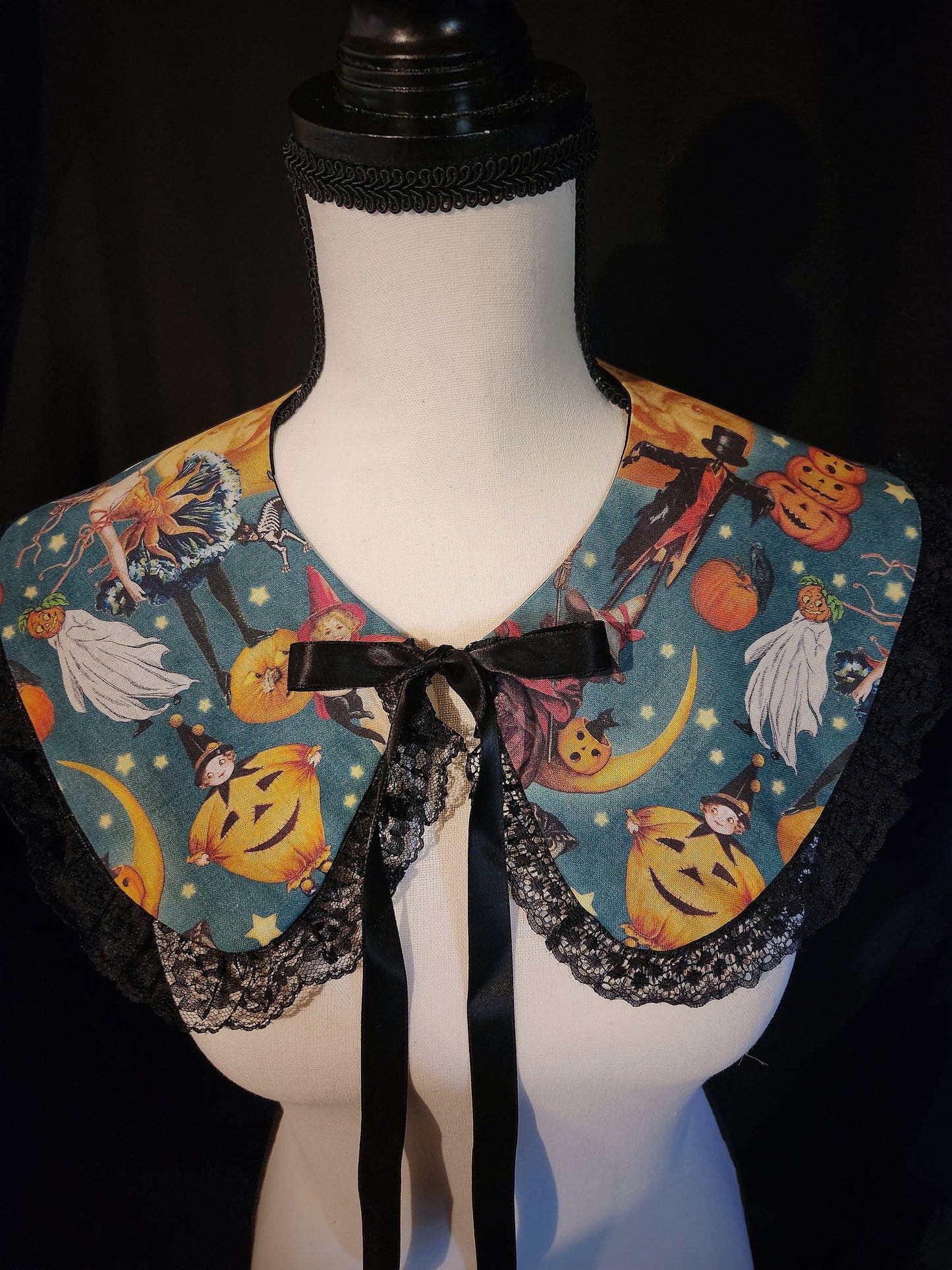 This reversible collar has vintage Halloween graphics on one side and black on the other for maximum wearability. It has details of black ribbon ties and black lace ruffle trim.
